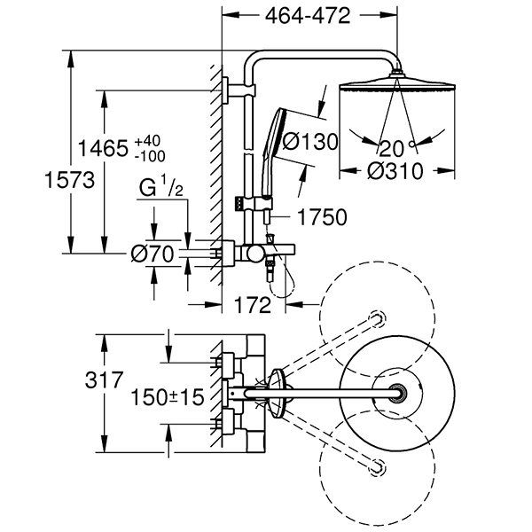 Верхний душ; Ручной душ; Штанга; Кронштейн; Шланг; Набор креплений