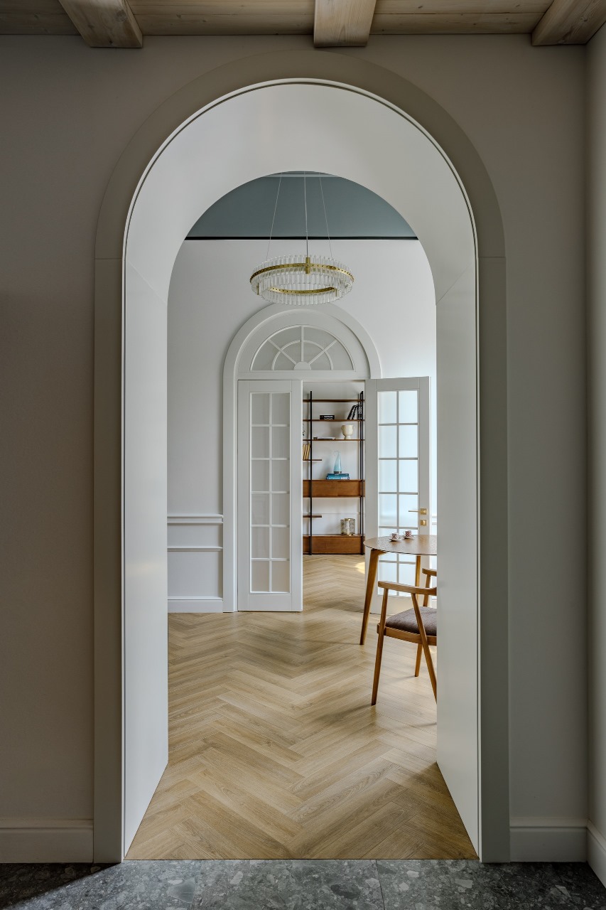 Ремонт начался со сноса старой покосившейся пристройки, которую заново построили с новым фундаментом, где сейчас находится прихожая, кухня и сан. узел. Вход в гостиную и столовую сделали в виде высокого аркообразного проема, вход в спальню зеркально отразили проем но уже с дверью, получилось что с кухни можно просматривать все комнаты в стиле залов Эрмитажа, так называемая Анфилада - Анфилада ― это ряд соединенных друг с другом помещений, которые расположены по прямой линии. Такая планировка визуально увеличивает пространство и дает зрителю возможность оценить весь интерьер в целом.